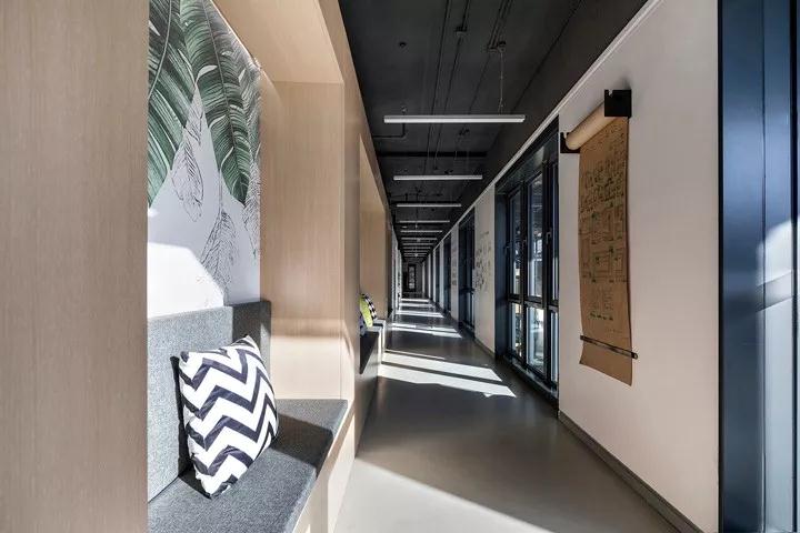 至于盒子以外的空間,設(shè)計(jì)師想凝聚更多的人文藝術(shù)氣息,選擇較多地去鋪陳展示各種抽象的藝術(shù)線條和畫作,同時(shí)為了不失去生活氣息,各個(gè)角落選擇顏色比較跳躍的家居什物,讓它作為一個(gè)流動(dòng)的戶外廣場(chǎng),讓人可以自在穿行其中,偶爾停駐觀察,經(jīng)得住人聲鼎沸的喧擾,亦能提供心靈靜憩的安寧。在這里,大家認(rèn)真辦公、生活、盡情交流、分享,它就是一個(gè)安放綠意,有極高包容度的公共空間。