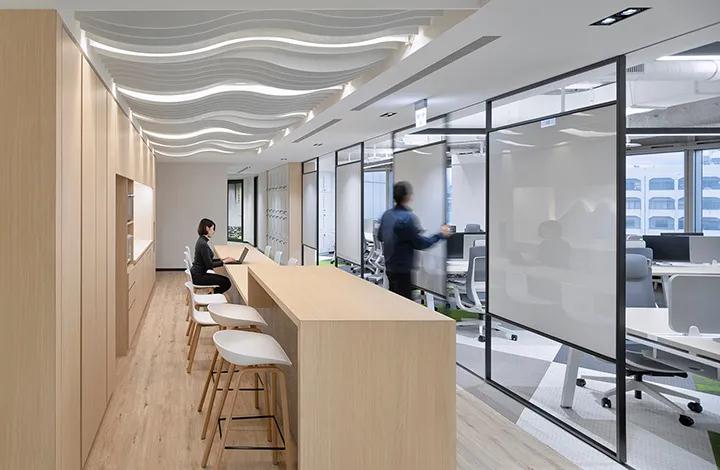 深圳裝飾公司通過模糊和重疊空間邊界,在視覺和功能方面放大并擴展了原始的狹窄空間。開放式辦公室區域分為綠色植物,并通過靈活的移動線連接。可以有效利用空間而不會失去活力,山區如咖啡區使用的材料也接近自然。山形的裝飾墻取材于回收咖啡豆制成的水泥板,再加上天花板的波浪形吸音吊板,加上柔和的燈光,在云霧之中營造出一個休閑空間山。