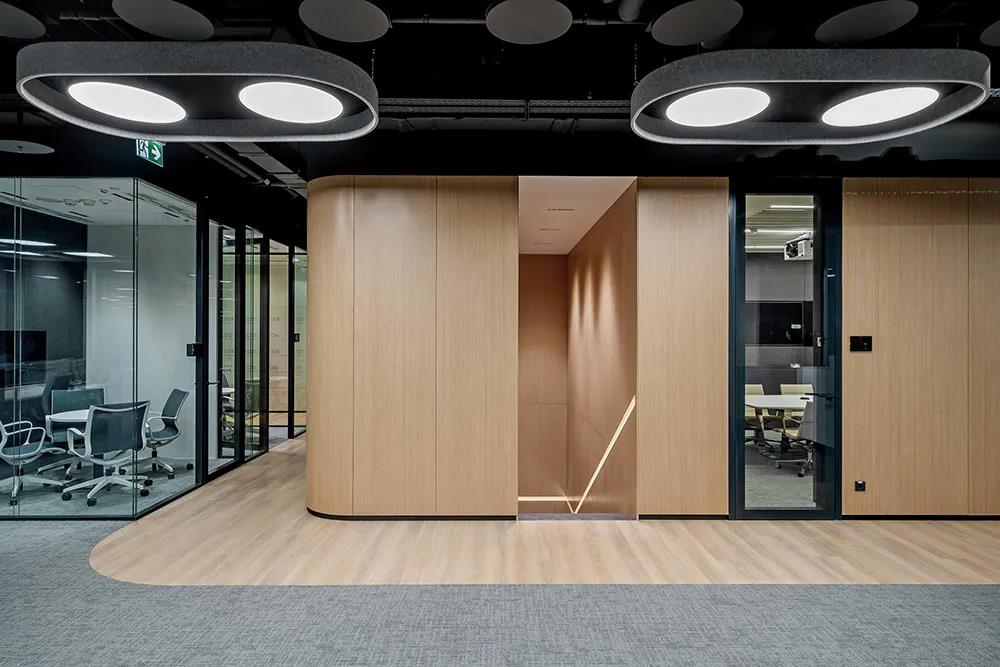 會議室的照明系統(tǒng)采用傳感器進行智能開關(guān)控制。深圳辦公室裝修設(shè)計流暢的弧線是本案的重要裝飾元素,源自汽車的經(jīng)典造型結(jié)構(gòu)。極簡色彩搭配黑、白、灰底色,勾勒出精致、簡潔、理性的專業(yè)品質(zhì)空間。溫暖柔和的橡木墻板和部分鋪裝的木紋地板以柔和的淺米色配色融入整體氛圍的營造。軟裝家具的亮色搭配,為開放的工作空間增添了多樣性,豐富了空間視覺。本案深圳裝飾公司所有裝飾材料均取得環(huán)保相關(guān)證書。