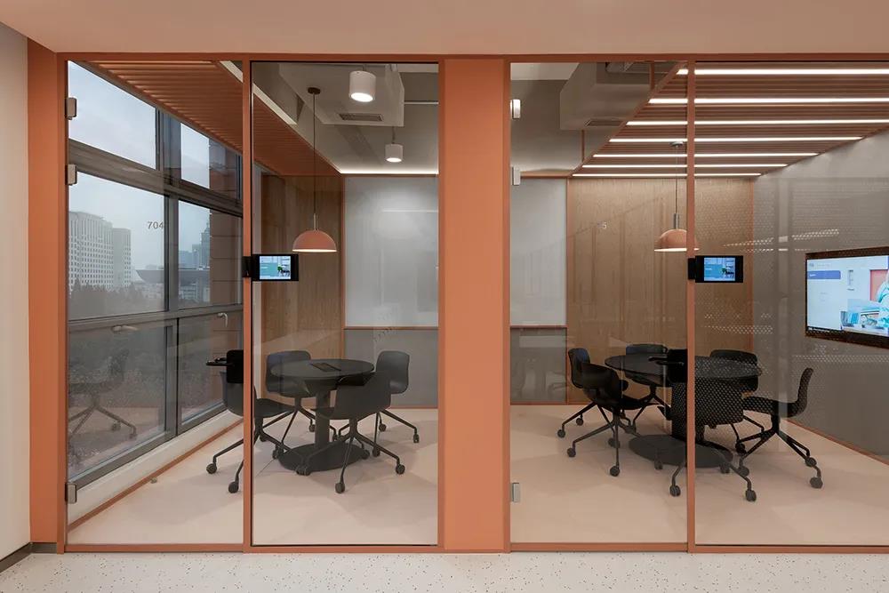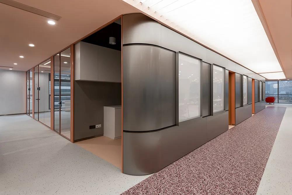 打造全新的辦公裝修空間。雙方合作設計,傳遞前沿時尚態度,定義未來科技驅動的辦公方式,整體設計是一個線性空間,三邊由高玻璃隔開包裹。深圳裝飾公司形成了秩序井然、合作便捷的辦公氛圍。設計試圖在一系列弧度和曲面的表現與工業風格的硬朗質感之間創造一種平衡感。中央走道的設計實現了迎賓和引導視線沿空間延伸的雙重功能。天花板是長條形拉伸膜光幕,外部裝飾有一層玻璃網格,與深紅色橢圓形乙烯基底座裝飾相反。深圳裝飾公司拉絲不銹鋼墻板外嵌有滑動白板和留言板,方便辦公室裝修設計過程中的合作。靠近入口的三間會客室和前臺均采用漸變長虹玻璃,顏色由粉色過渡到透明。會議室的墻壁是柔和的粉紅色,深圳裝飾公司嵌入了不對稱裝飾板,天花板是橢圓形透明膜,地面是深藍色的德嘉地板。接待區和辦公區由弧形黑框不銹鋼穿孔板屏風隔開。屏幕鏤空圖案的大小由下至上逐漸設計,既保護隱私又保證視野內的廣闊視野,空間四周環繞著會議室、印刷室、茶室和一些安靜的角落,周圍環繞著珊瑚色的金屬屏風。