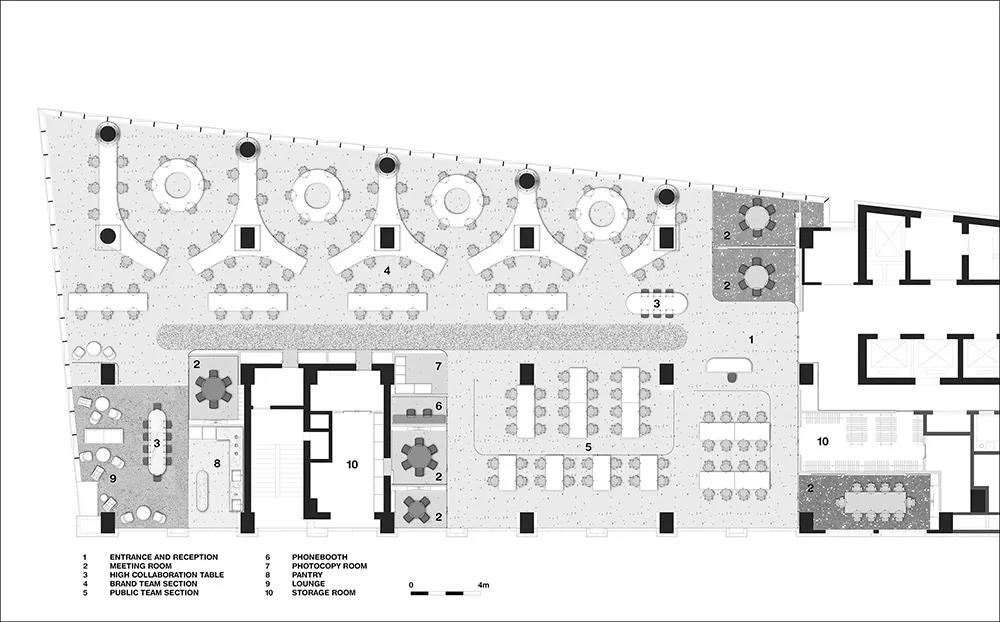 深圳裝飾公司上述空間的內部和天花板也延續了屏幕元素,與裸露的混凝土天花板形成對比。茶室里有一個由卡拉白大理石制成的波浪島。休息室的地板是軟木地板,擺放著一張質感很強的定制大理石長桌。衛生間的家具都是人造家具。空間內規劃了可容納100人以上的培訓室、直播室、會議室等多個功能空間。墻壁設計不同:有些是木條,有些是波浪形布墻板。